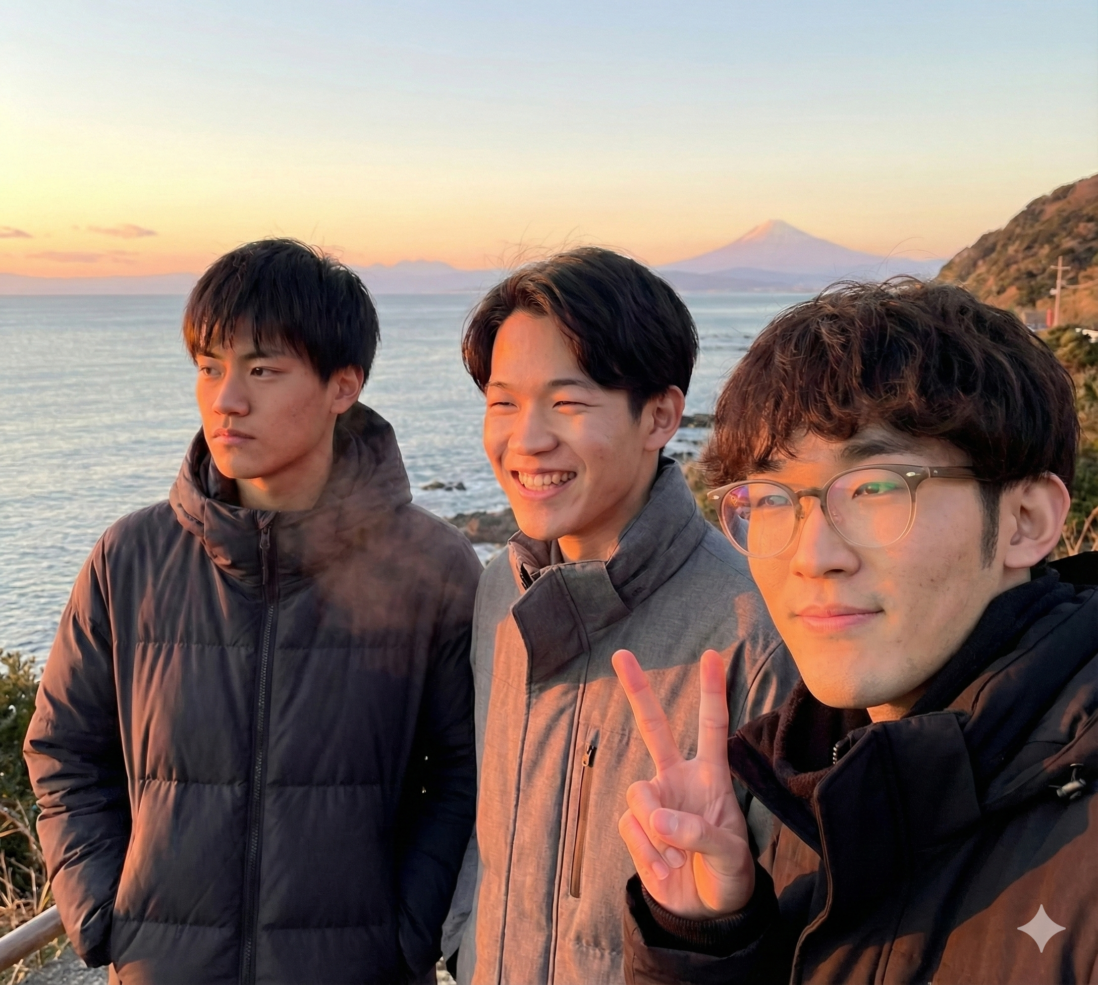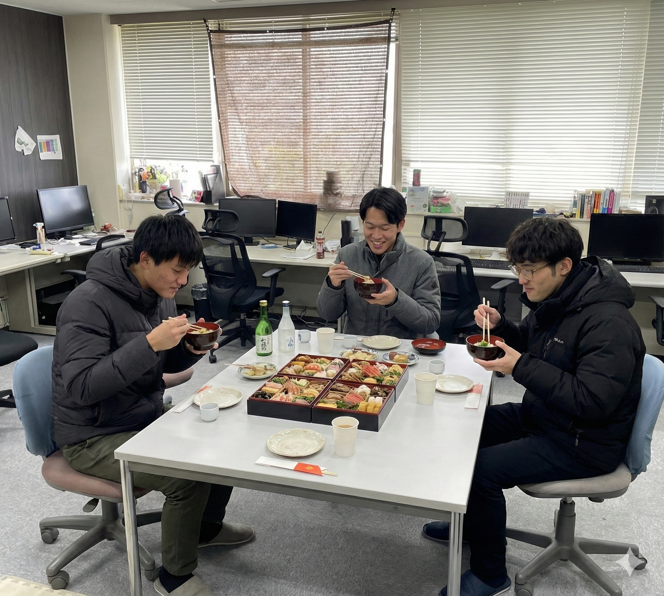 1枚目はメンバーで初日の出を見ている画像、2枚目は研究室でおせちを食べている画像です。殺風景になりがちな研究室が、AIの力で一気に温かみのある団らんの場へと変わりました。